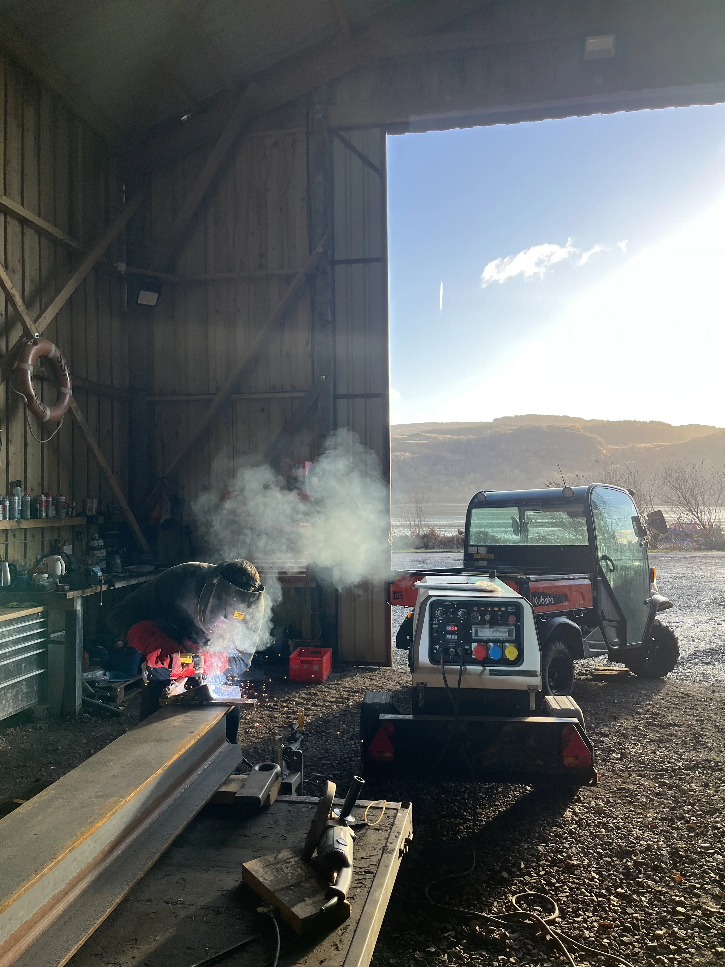 During the quieter months there are many jobs to do. They can range from general maintenance on the boats to a bit of welding. This time Struan had the hot metal glue gun out prepping one of the boat trailers. A new galvanised draw bar, to ensure it lasts against the salty environment.